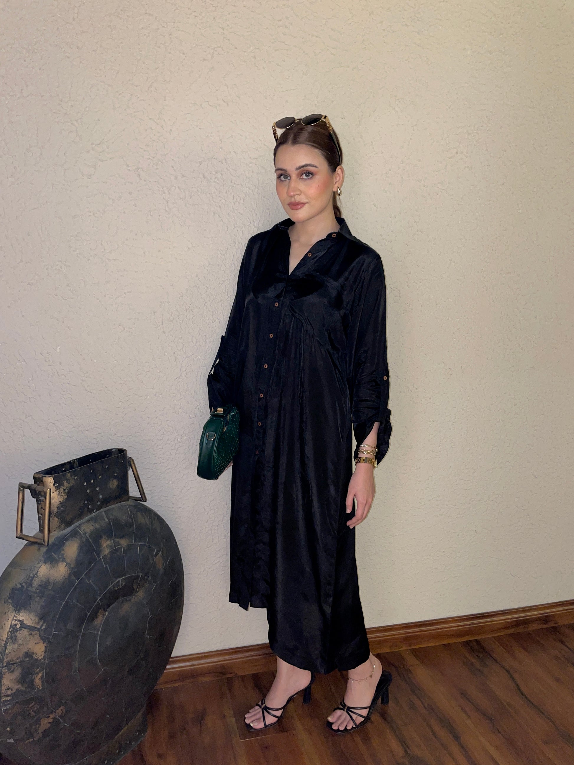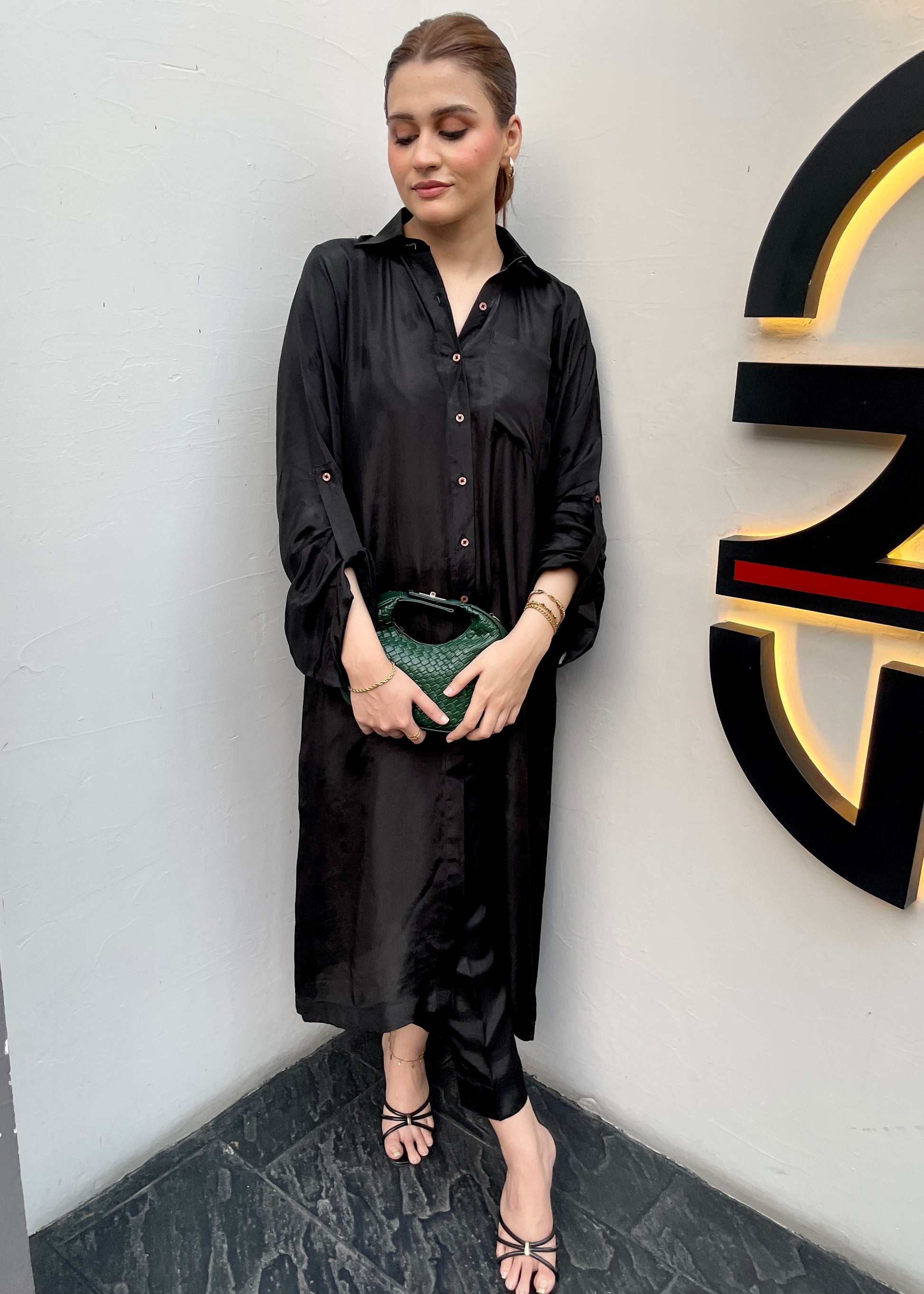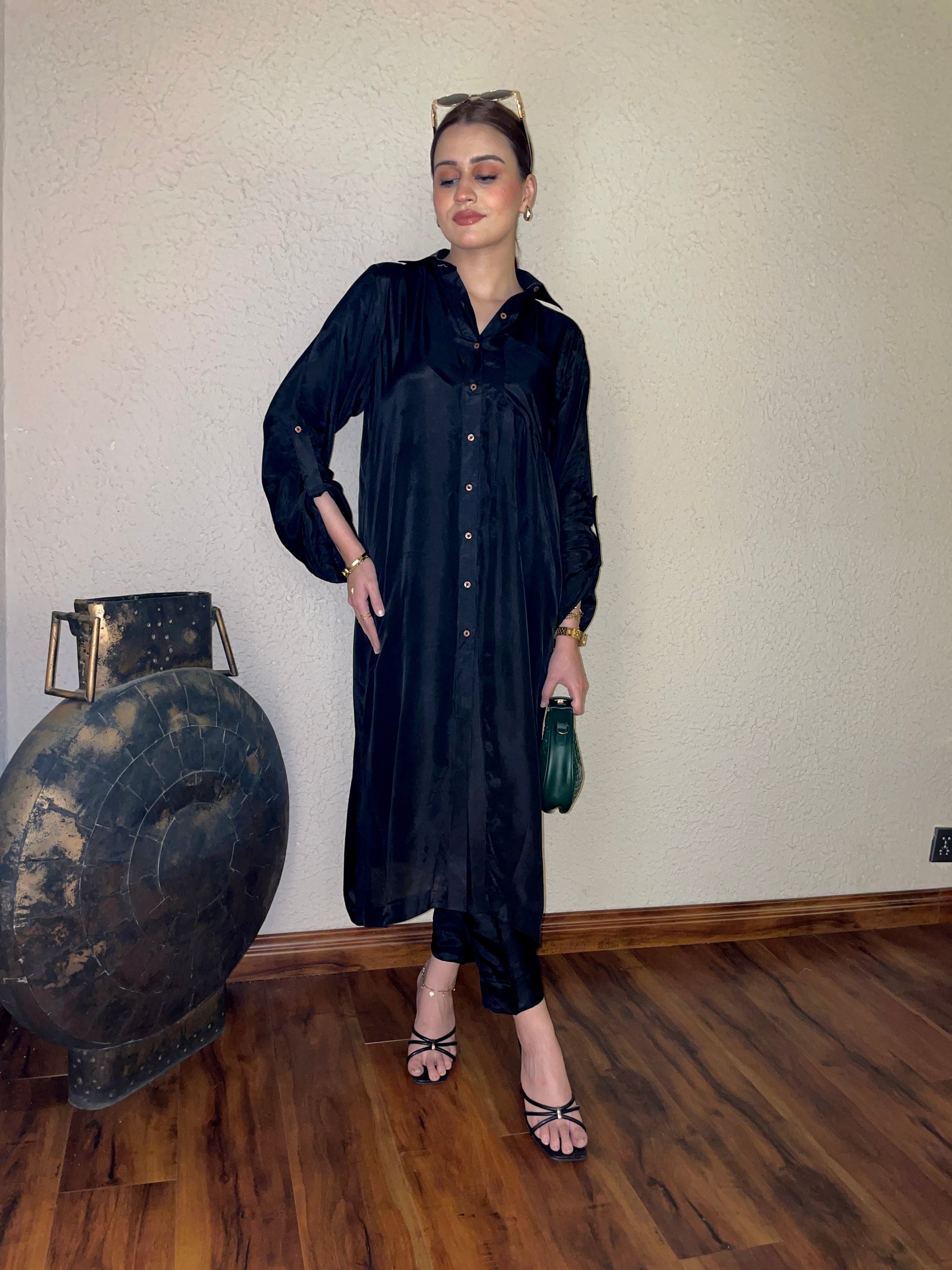A timeless 2-piece solid outfit in classic black, tailored on luxurious Tussel silk. Featuring a sleek collared shirt paired with straight trousers, this set embodies minimal sophistication — a versatile wardrobe essential for day or night.